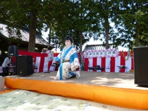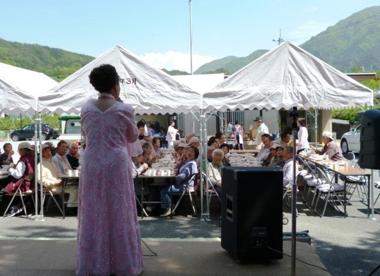 周囲の青葉の中を、爽やかな風が吹き渡ってくる5月、光珠荘では『花よりだんごの会』を毎年開催しています。この日には、地域の高齢者や法人の関係者をお招きして、入所者の皆さんと一緒に食事をしながらの交流やボランティアによる催し物で楽しみます。本日は初夏の晴天に恵まれました。今回の催し物は、「旗川一座」の皆様による歌謡と舞踊、「二胡の風」の皆様による二胡の演奏です。歌手の米山むつ美様の歌声は新緑の中に美しく響き、旗川座長の演じる舞踊と曲間の楽しいMCで盛り上がりました。「二胡の風」の皆様が奏でる二胡のきれいな音色には気分がやすらぎました。会場からは曲に合わせ口ずさむ歌声も聞こえてきました。例年と少し趣向を変えて行った今回の花よりだんごの会でしたが、入所者の皆さん、地域の皆様ともに喜んでいただけました。いつもと違う気分で青空の下で食事をして、施設の外の方々と交流することは、とてもよい刺激になります。